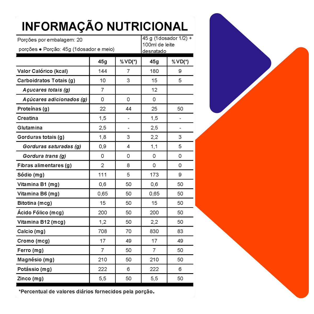 Ingredientes: Proteína Concentrada do Soro do Leite, L-glutamina, Creatina monohidratada e micronizada, mix de vitaminas e vitaminas e minerais (carbonatode cálcio, sulfato ferroso, sulfato de magnesio monohidratado, Picolinato de cromo, Tiamina mononitrato, Cloridrato de piridoxina, Ácido N-pteroil-L-glutâmico, Cianocobalamina,biotina, Bisclicinato de zinco, psyllium, ômega 3 vegetal,aroma idêntico ao natural, goma guar, edulcorante sucralose.